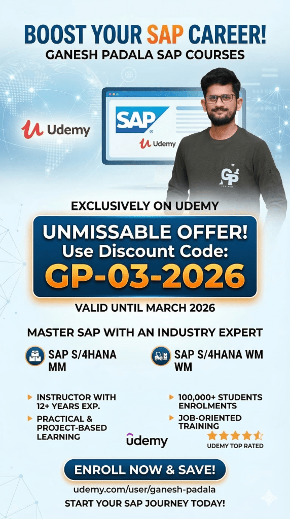 Dear All, You can find the link below discount links for the month of March 2026. I hope those will be helpful for you. Happy Learning. You can provide your valuable rating once you complete the course. ECC and S/4 HANA SAP MM Udemy Courses in sequence: SAP ECC and S/4 HANA MM Organization Structure … Continue reading Udemy discount links for March 2026