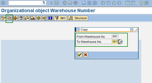 Then click on Copy icon and provide input details as shown below. Generally, from warehouse number is given as standard warehouse number 001 or as per the requirement. And to warehouse number field will be filled with the warehouse number which has to be created