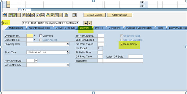 If you enter a return delivery or reversal for an item whose “delivery completed” indicator has already been set, so that the delivered quantity falls below the under delivery tolerance limit, the “delivery completed” indicator is automatically reset. In this case, the system issues a warning message informing you that the “delivery completed” indicator has been reset.