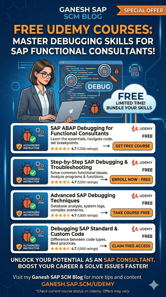 Dear All, You can find the below discount links for the month of October to November 2025. I hope those will be helpful for you. Happy Learning. You can provide your valuable rating once you complete the course. ECC and S/4 HANA SAP MM Udemy Courses in sequence: SAP MM Organization Structure and Master Data … Continue reading October to November 2025 SAP Discount Links of Ganesh Padala